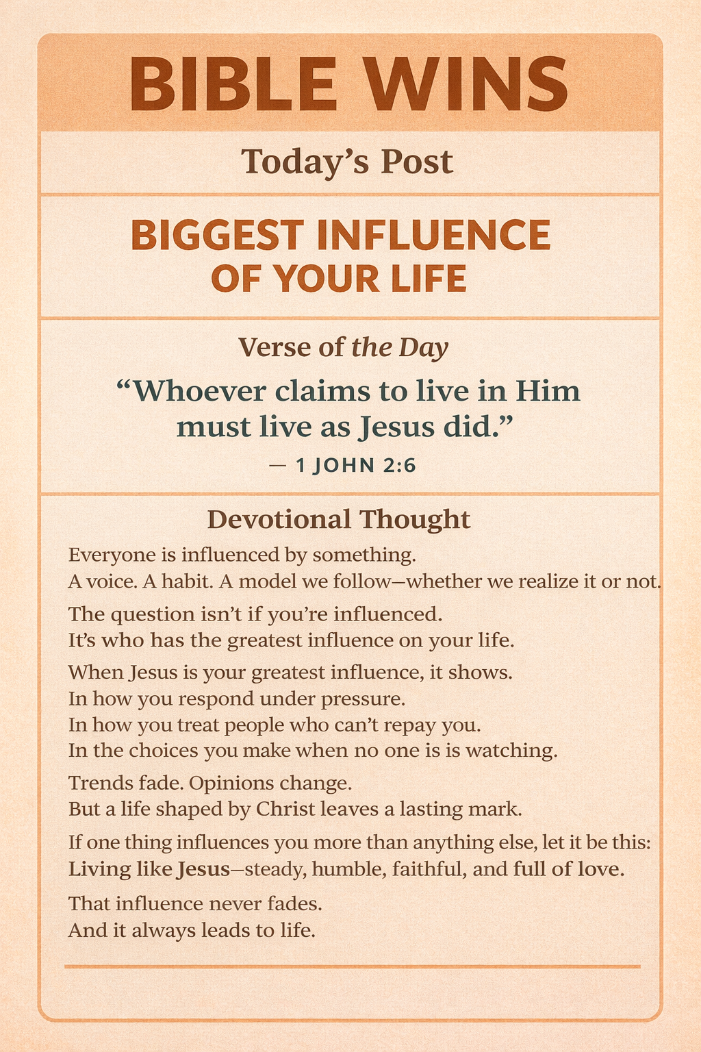 “Whoever claims to live in Him must live as Jesus did.” Everyone is influenced by something.A voice. A habit. A model we follow—whether we realize it or not.The question isn’t if you’re influenced.It’s who has the greatest influence on your life. When Jesus is your greatest influence, it shows. In how you respond under pressure.In … [Read more…]